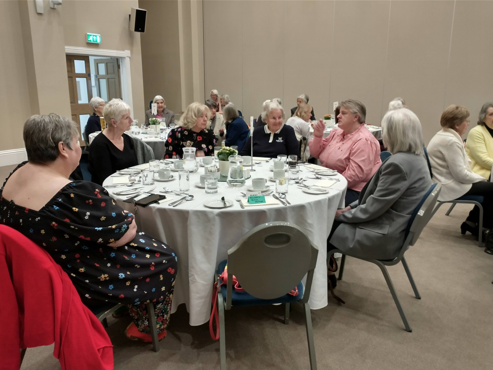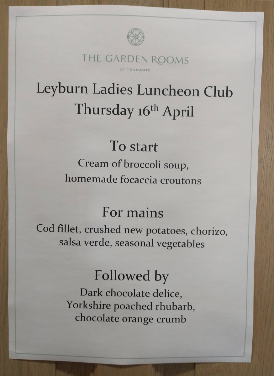 Ladies enjoyed a delicious lunch starting with cream of broccoli soup with homemade focaccia croutons, followed by cod fillet with crushed new potatoes, chorizo, salsa verde and seasonal vegetables. Dessert was a dark chocolate delice served with Yorkshire poached rhubarb and chocolate orange crumb. Coffee or tea and after dinner mint concluded the meal.
