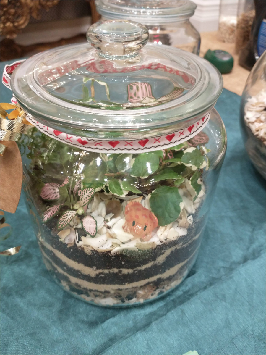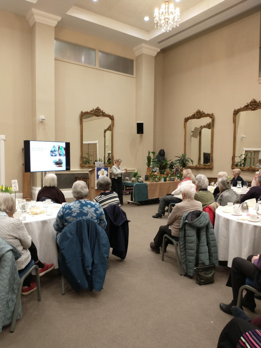 Sharon shared with members the history of terrariums, from accidental plant growing on research expeditions to the amazing 64-year-old terrarium that still thrives today.  Members then watched as Sharon demonstrated how to plant up a terrarium, explaining the importance of the different layers of growing medium that contribute to a successful terrarium and advising on suitable tools for terrarium gardening.